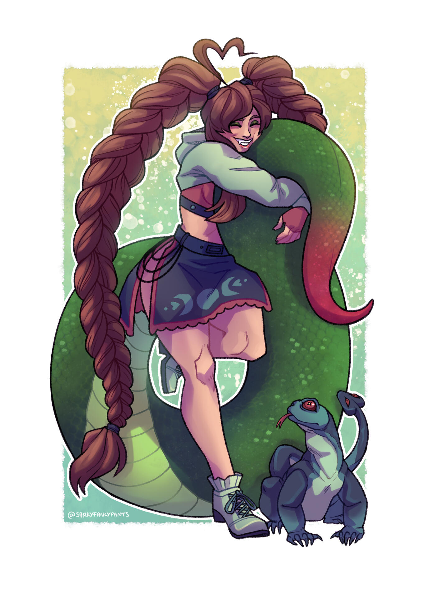 Born a Naga Envy was incredibly sheltered as a snakelet not knowing the outside world, as they grew up they were on there own curious on exploring, they wanted to make as many stories in there adventures as they possibly can living deep deep in the forest that was near a nature trail. Envy collected trinkets, clothes and other items humans left behind or forgotten about, still determine they wish to make one human friend or at least try there very best to make great impressions and not scare them.
