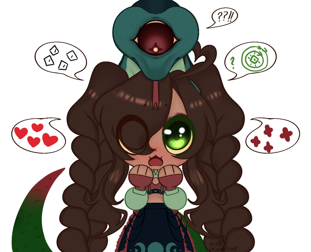 Envy is a Snake girl that knows no stranger, spends her moments in the sun and explores in a deep forest she resides that rumors to be monsters in when in reality it's just her slithering around , come give this little guy a friendly hello!