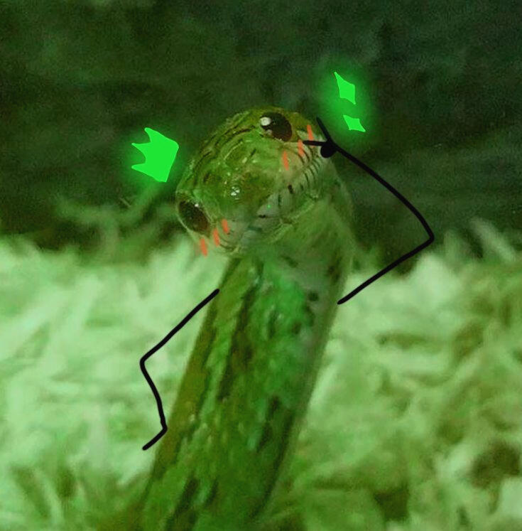 A Adventurous, curious, hyperactive snake that spend most of there time collecting trinkets or other treasures that they find along there journey.
